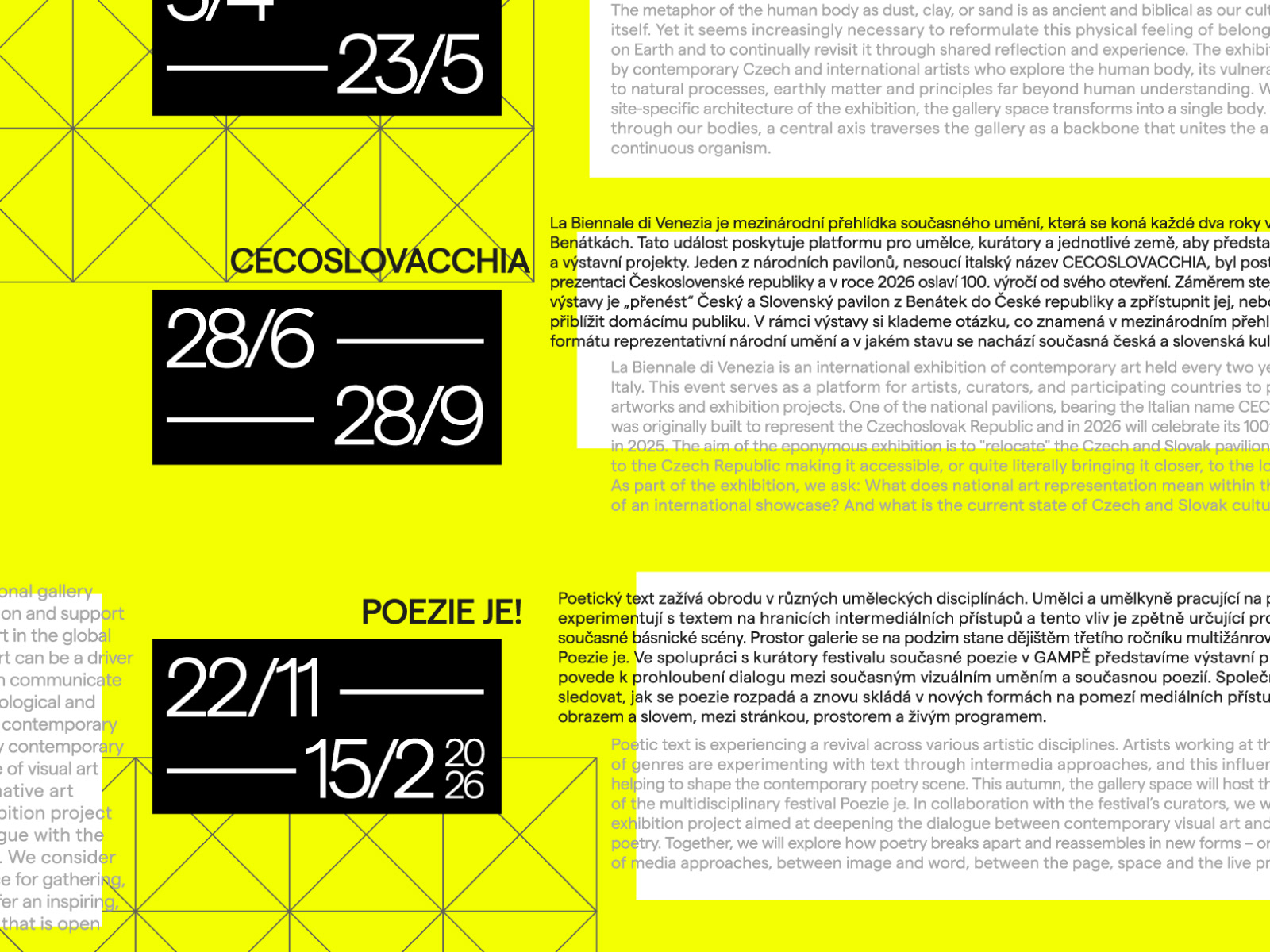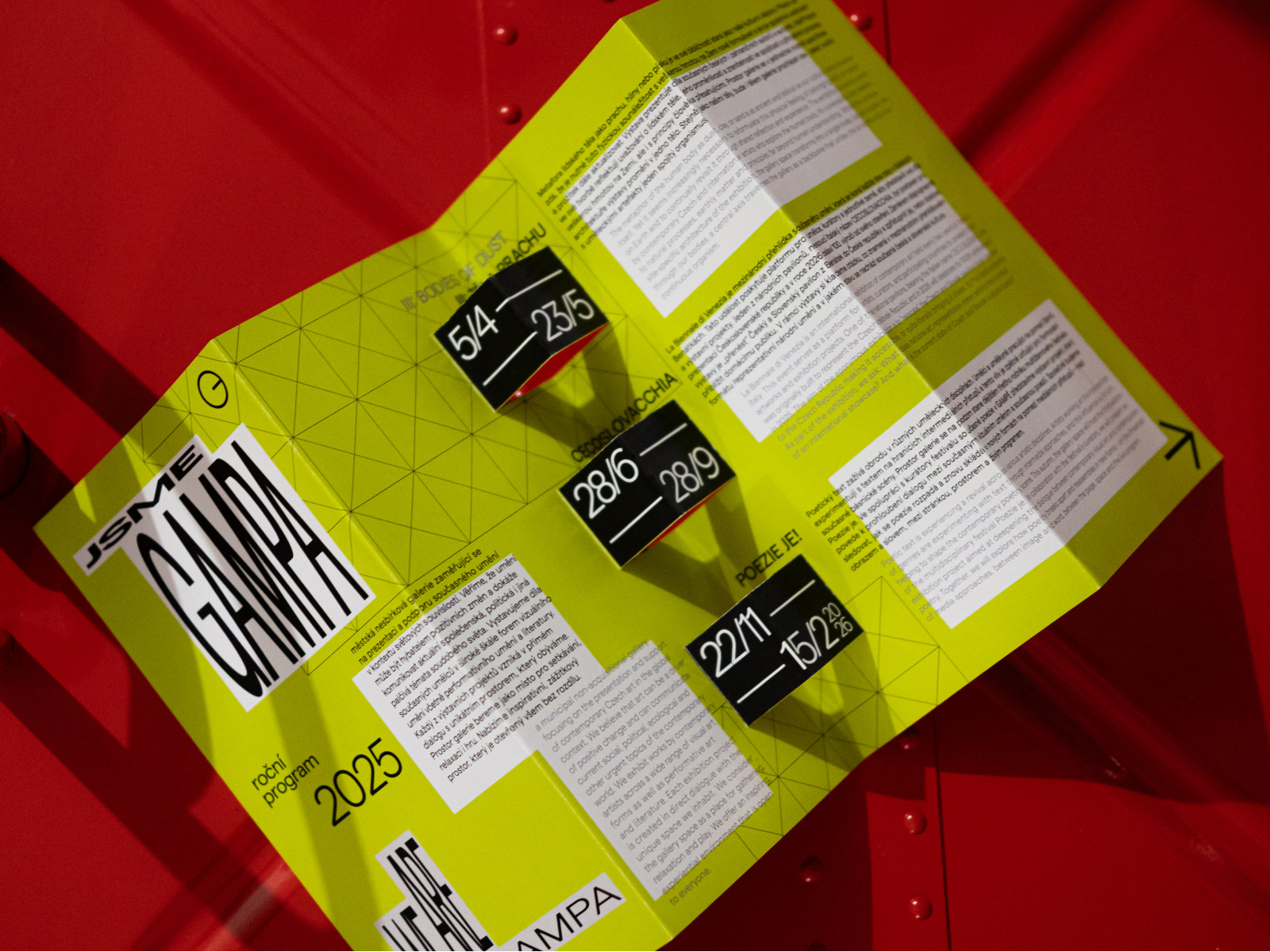 Sazba ročního programu pro Galerii města Pardubic. (GAMPA) Program je koncipován jako skládací leporelo s vystupujícími daty akcí. Cílem je vytvoření prostorového artefaktu, který by co nejvíce odrážel zaměření galerie, tedy na současné umění.